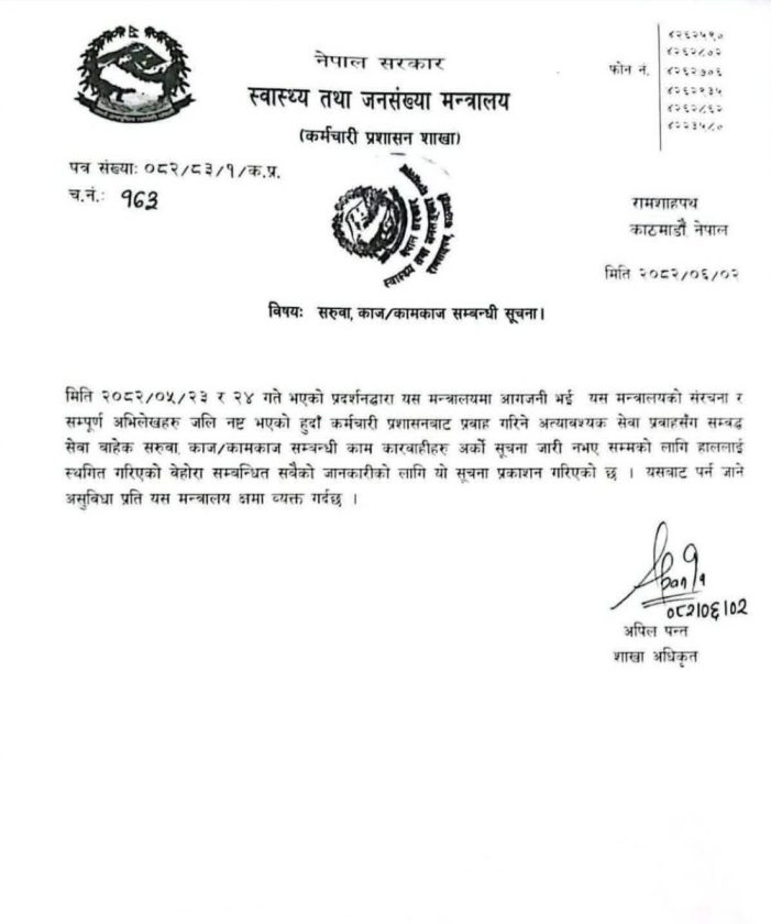 स्वास्थ्यसमाचार/ स्वास्थ्य तथा जनसंख्या मन्त्रालयले अत्यावश्यक सेवा प्रभावसंग सम्बन्धित सेवा बाहेक सरुवा, काज, कामकाज सम्वन्धी काम कारवाहीहरु स्थगित भएको जनाएको छ ।