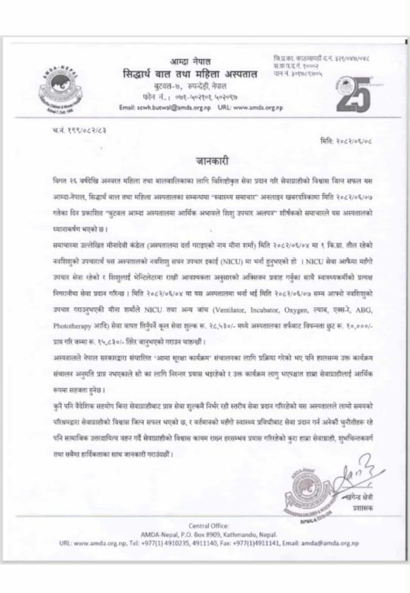 स्वास्थ्यसमाचार/ सिद्धार्थ बाल तथा महिला अस्पताल, बुटवलले नवजात शिशु उपचार खर्चबारे हालै सार्वजनिक भएको समाचारप्रति ध्यानाकर्षण भएको जनाएको छ।