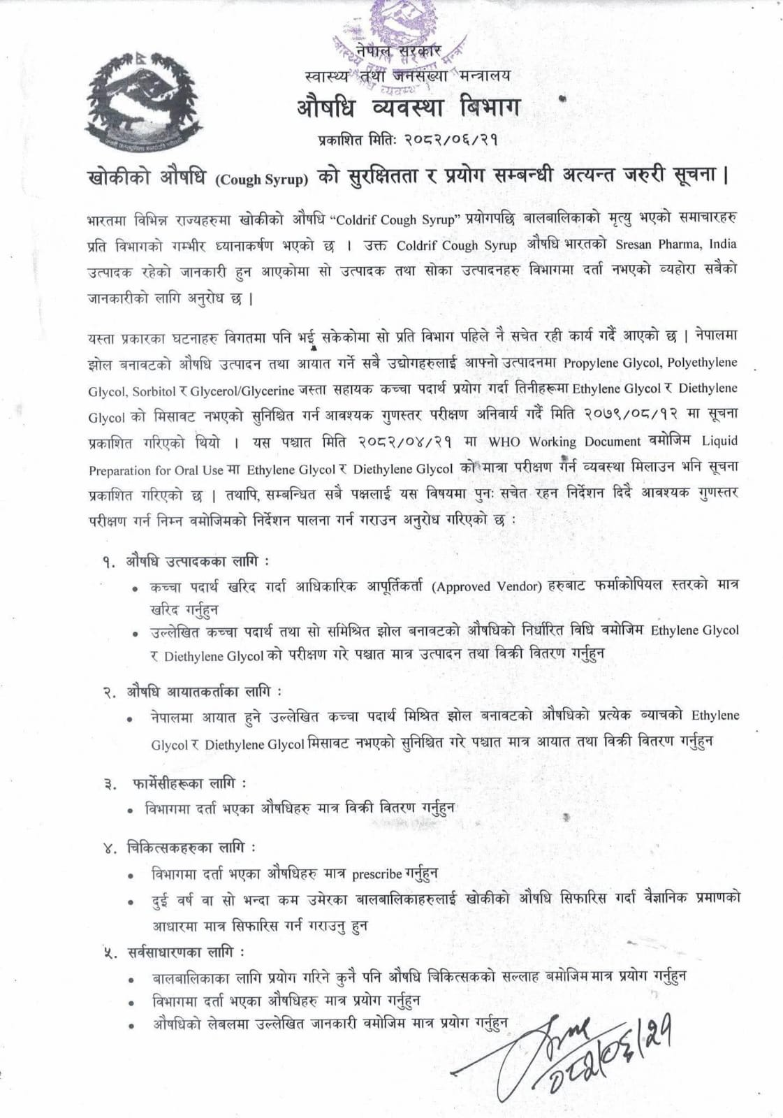 ‘कोल्ड्रिफ कप सिरप’ नेपालमा दर्ता छैन : औषधि व्यवस्था विभागको सतर्कता सूचना