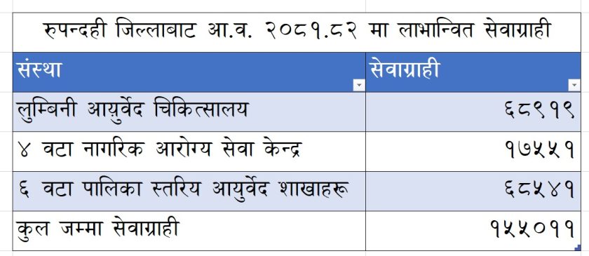 स्वास्थ्यसमाचार/ रुपन्देही जिल्लाभित्रका विभिन्न आयुर्वेद स्वास्थ्य संस्थाबाट आर्थिक वर्ष २०८१/८२ मा करिब एक लाख ५५ हजार सेवा ग्राही स्वास्थ्य सेवा लिएका छन्।
