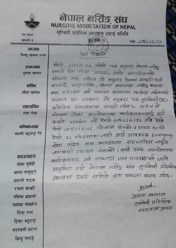 नेपाल नर्सिङ संघ लुम्बिनी प्रादेशिक अस्पताल इकाई समितिले जारी गरेको विज्ञप्तिमा संघले अघि सारेका मागहरूको समर्थनमा अस्पतालका सबै नर्सहरूले आन्दोलनका कार्यक्रमहरूमा सक्रिय सहभागिता जनाउने उल्लेख गरिएको छ।