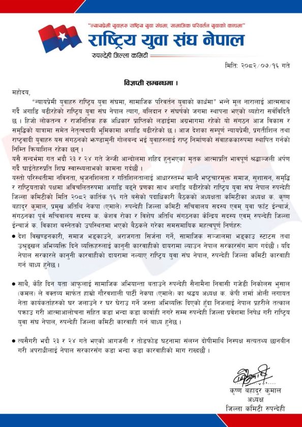 स्वास्थ्यसमाचार/ कलम भुसाल (निकोलस) लाई तत्काल पक्राउ गरी कारबाही गर्न युवा संघ नेपाल, रुपन्देहीले माग गरेको छ । आइतबार बसेको बैठकले भुसाललाई तत्काल पक्राउ गरी आत्मालोचनासहित कडा कारबाही नगरेसम्म रुपन्देही प्रवेशमा रोक लगाउने निर्णय गरेको अध्यक्ष कृष्ण कुमालले जानकारी दिए ।
