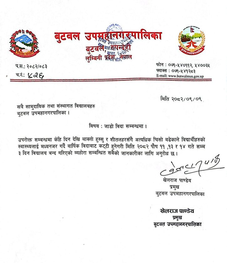 बुटवल उपमहानगरपालिकाका प्रमुख खेलराज पाण्डेयद्वारा जारी सूचनामा वार्षिक विदाबाट कट्टी हुने गरी विद्यालय बन्द गर्न अनुरोध गरिएको छ। नगरपालिकाले सबै विद्यालयलाई उक्त निर्णय कार्यान्वयन गर्न निर्देशन दिएको छ।