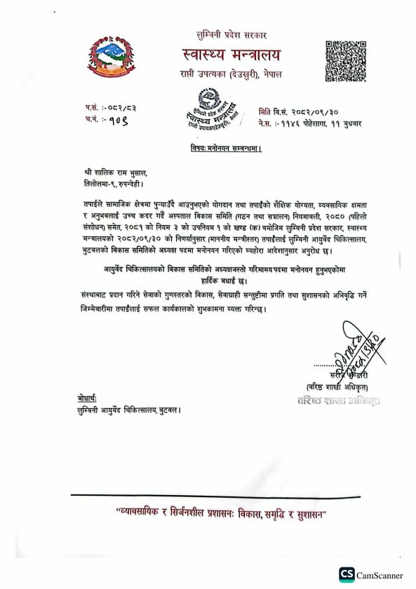 स्वास्थ्यसमाचार /स्वास्थ्य मन्त्रालयले लुम्बिनी आयुर्वेद चिकित्सालय, बुटवलको विकास समितिको अध्यक्षमा शालिकराम भुसाललाई नियुक्त गरेको छ।