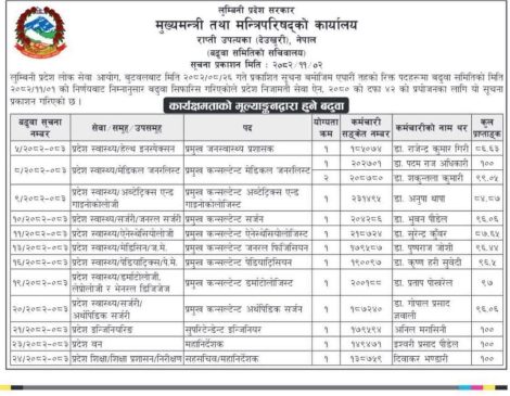 स्वास्थ्यसमाचार/ लुम्बिनी प्रदेश सरकार अन्तर्गत स्वास्थ्य क्षेत्रका दश जना वरिष्ठ अधिकारी ११ तहमा बढुवा भएका छन्। मुख्यमन्त्री तथा मन्त्रिपरिषद्को कार्यालयले कार्यसम्पादन मूल्याङ्कनका आधारमा स्वास्थ्यका दस जना वरिष्ठ सहित १३ जना कर्मचारीलाई बढुवा गरेको छ ।