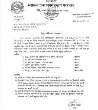 स्वास्थ्य तथा जनसंख्या मन्त्री निशा मेहताको मन्त्रिस्तरीय निर्णयअनुसार मन्त्रालयका अतिरिक्त सचिव डा. श्रीकृष्ण श्रेष्ठको संयोजकत्वमा छ सदस्यीय समिति गठन गरिएको हो।