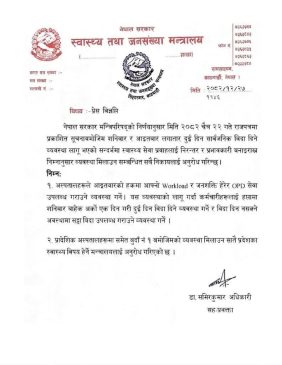 मन्त्रालयका सह-प्रवक्ता डा. समिरकुमार अधिकारीद्वारा हस्ताक्षरित विज्ञप्तिमा आइतबारको हकमा कामको भार र जनशक्ति हेरेर ओपीडी सेवा उपलब्ध गराउने व्यवस्था गर्न भनिएको छ ।