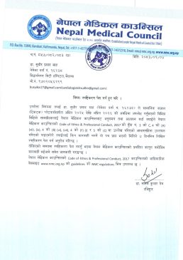 काउन्सिलले भैरहवाका डा। सुधीर प्रसाद साह स्पष्टीकरण सोधेको हो । उनले टिकटक लगायत सामाजिक सञ्जाल प्लेटफर्ममा २०२५ अप्रिल देखि २०२६ अप्रिलसम्म अपलोट गरेका भिडियो सामग्रीहरू अध्ययन गर्दा आचारसंहिता उल्लङ्घन भएको देखिएको काउन्सिलले जनाएको छ ।