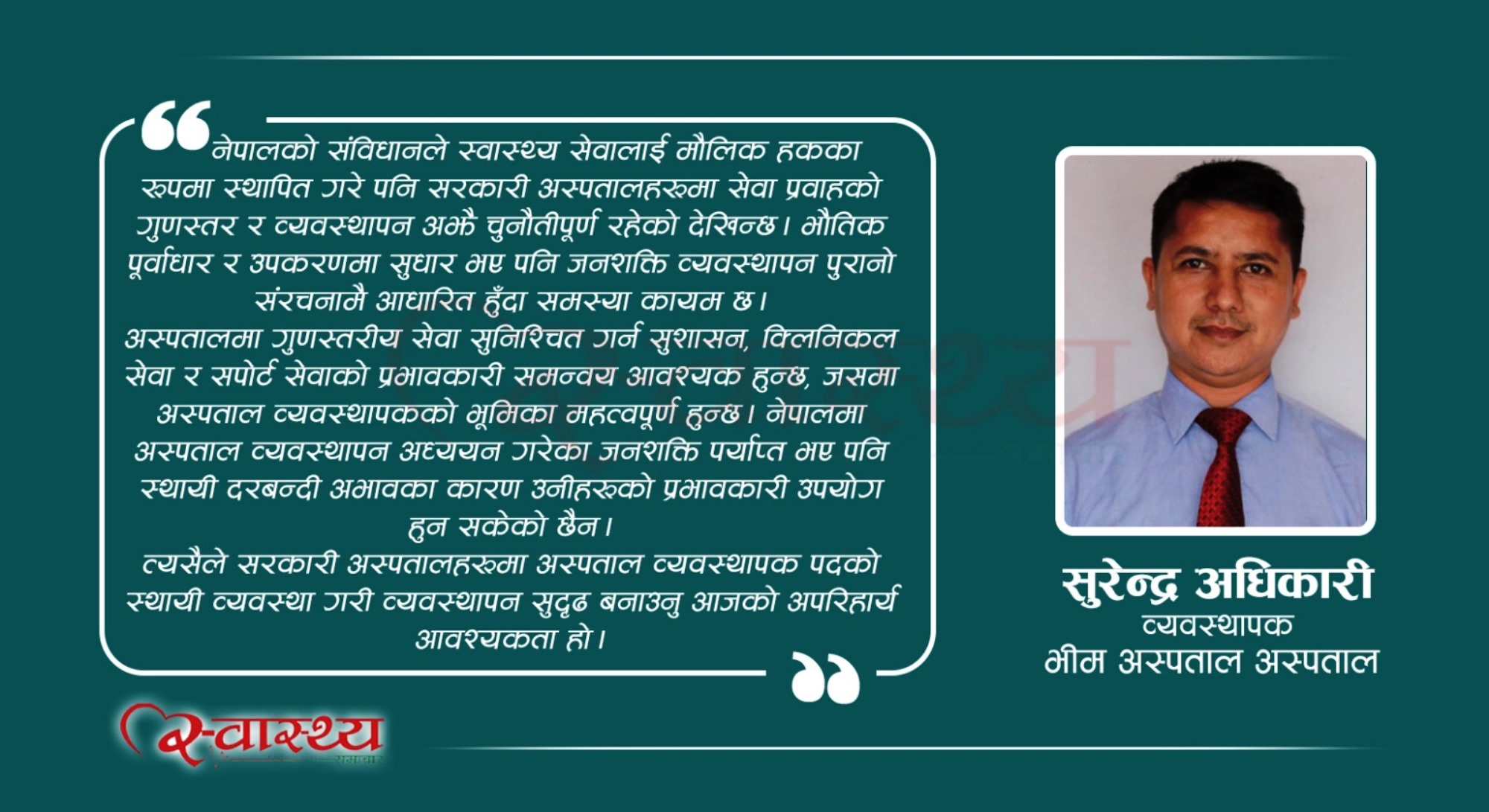 स्वास्थ्यसमाचार /लुम्बिनी प्रादेशिक अस्पतालको संरचनागत विकास निर्माण कार्यमा अवरोध पुग्ने गरी कुनै कार्य नगर्न अस्पतालका मेडिकल सुपरिटेन्डेण्ट डा. राजेन्द्र खनालले आग्रह गरेका छन् । मेसु डा. खनालले १ सय ९ वर्षको इतिहास बोकेको अस्पतालको सेवा र सुविधा तथा भौतिक संरचनाको अवस्थालाई हेर्दा संरचना अवश्यक रहेको बताए । उनले सेवाग्राहीहरुको मन जित्ने तथा सन्तोषजनक सेवासमेत नभएको प्रति संवेदनशील बनेर सोच्न व्यवसायीहरुलाई आग्रह गरे । बुटवलको एक कार्यक्रममा बोल्दै डा. खनालले नेपालको स्वास्थ्य क्षेत्रमा गुणात्मक सुधार जरुरी रहेको बताए । उनले लुम्बिनी प्रादेशिक अस्पताललाई योजनाबद्ध स्तरवृद्धि गर्न नसके आम नागरिकले आवश्यक स्वास्थ्य…